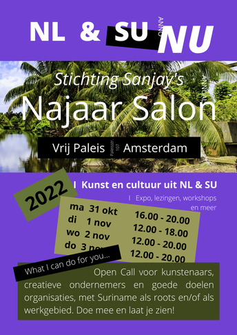 Ben jij een kunstenaar met Surinaamse roots, of is Suriname het onderwerp van je kunst? Geef je dan op voor deelname aan de Najaar Salon 2025 welke van woensdag 15 t/m zondag 19 oktober te bezoeken is in het Vrij Paleis aan de Paleisstraat 107 in Amsterdam. Stuur een mail met je naam, foto's van je werk en je website/socials naar stichtingsanjay@gmail.com en curator Johan komt naar je toe. DOEN!