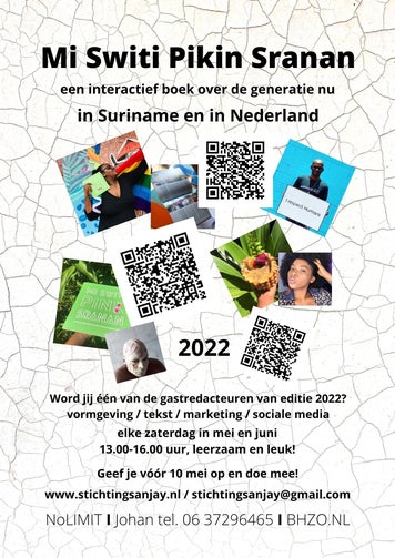 Na twee edities van het interactieve boek Mi Switi Pink Sranan, met 2 x 6 persoonlijke verhalen over wonen en werken in Sranan (Suriname), gaat ons interactieve boek vanaf 2022 verder als echt tweelandenproject. Onder de iets aangepaste titel Mi Switi Pikin Sranan presenteert het boek voortaan persoonlijke verhalen over wonen en werken in Suriname én in Nederland. Check ook dit seizoen op de eigen facebookpagina: