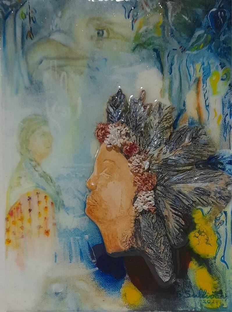 I am the flower of my ancestors, acryl, keramiek en epoxy op doek, 3 D werken, 18 x 24 cm, € 225